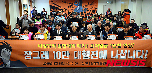 운동본부는 기자회견문을 통해 ‘비정규직종합대책 폐기, 최저임금 1만원 인상’을 촉구했다. 2015.03.18.