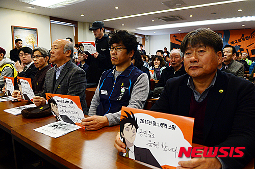 【서울=뉴시스】조성봉 기자 = 18일 오전 서울 중구 정동 프란치스코 교육회관에서 열린 '장그래 살리기 운동본부 출범 기자회견에서 한상균 민주노총 위원장을 비롯한 참가자들이 '2015장그래의 소망' 손피켓을 들고 있다.
