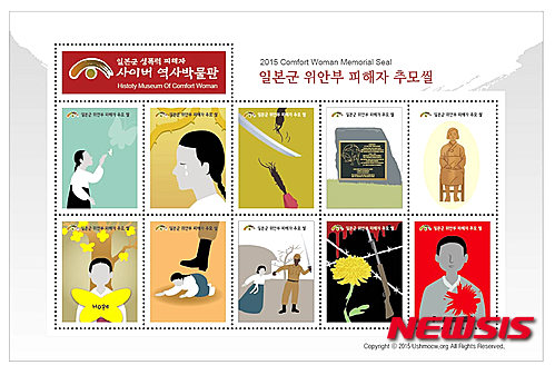 【뉴욕=뉴시스】노창현 특파원 = 뉴욕서 운영되는 일본군 성폭력 피해자 사이버역사박물관(www.ushmocw.org)이 위안부 피해자를 추모하는 특별우표를 제작했다고 22일 밝혔다. '일본군 위안부 피해자 추모 씰(Comfort Woman Memorial Seal)'은 총 10종이 한 시트로 구성됐으며 한국의 유명 일러스트들이 참여해 일본군 위안부 피해자들의 명예 회복과 인권, 아픔, 상처, 사랑, 희망, 추모 등을 표현했다. 위안부 피해자 기념우표는 지난해 한국에서 처음 발행한 바 있으며 해외에선 이번이 처음이다. 2015.03.23. <사진=일본군 성폭력 피해자 사이버역사박물관 제공>