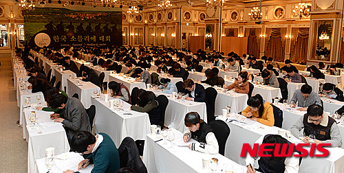 【서울=뉴시스】고범준 기자 = 26일 오전 서울 강남구 논현동 임피리얼 팰리스 호텔에서 프랑스 농업식품산림부(MAAF)가 주최, 소펙사 코리아(SOPEXA KOREA)가 주관하는 제14회 한국 소믈리에 대회 1차 예선에서 참가자들이 와인 향을 음미하며 문제를 풀고 있다. 2015.03.26.