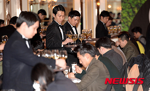 【서울=뉴시스】고범준 기자 = 26일 오전 서울 강남구 논현동 임피리얼 팰리스 호텔에서 프랑스 농업식품산림부(MAAF)가 주최, 소펙사 코리아(SOPEXA KOREA)가 주관하는 제14회 한국 소믈리에 대회 1차 예선에서 관계자들이 참가자들에게 와인을 건네주고 있다. 2015.03.26.