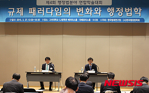 【서울=뉴시스】27일 서울 성북구 고려대학교 CJ법학관에서 '규제패러다임의 변화와 행정법학'을 주제로 열린 '한국법제연구원-한국행정법학회 연합학술대회'에 참석한 서울대학교 이원우 법학전문대학원 교수가 발제를 하고 있다. 2015.03.27. (사진=한국법제연구원 제공)