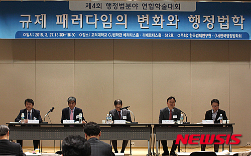 【서울=뉴시스】27일 서울 성북구 고려대학교 CJ법학관에서 '규제패러다임의 변화와 행정법학'을 주제로 열린 '한국법제연구원-한국행정법학회 연합학술대회'에 참석한 조규범 국회 입법조사처 입법조사관, 최환용 한국법제연구원 연구위원, 이은기 서강대학교 교수, 성승제 한국법제연구원 연구위원, 장용근 홍익대학교 교수가 발표를 하고 있다. 2015.03.27. (사진=한국법제연구원 제공)