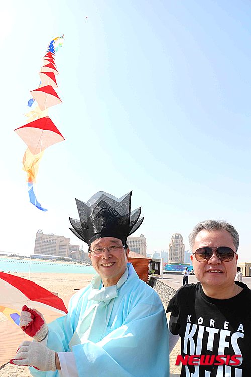 【서울=뉴시스】주카타르 한국대사관 주최로 카타르 수도 도하 문화마을인 카타라에서 전통문화단체 한국연협회(회장 리기태)와 카타르항공사 주관으로 한국연날리기 행사가 28일(현지시간)부터 29일까지 양일간 열렸다. 사진은 창작줄연을 걸프만 바다위로 올리는 리개태 회장과 임동일 부회장.
