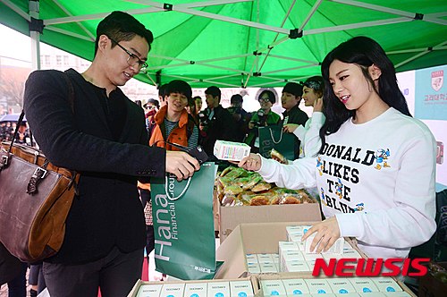 【서울=뉴시스】전신 기자 = 31일 서울 성북구 고려대학교에서 열린 간식 나눔 행사에서 오렌지캬라멜이 학생들에게 간식을 나눠주고 있다. 2015.03.31.
