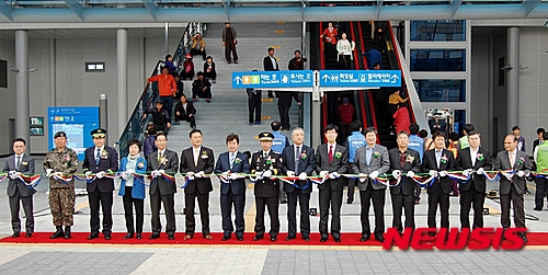 【익산=뉴시스】강명수 기자 = 박경철 전북 익산시장과 이춘석 국회의원 등 내빈들이 2일 익산역에서 호남고속철도 개통을 축하하며 테이프를 자르고 있다. 2015.04.02.