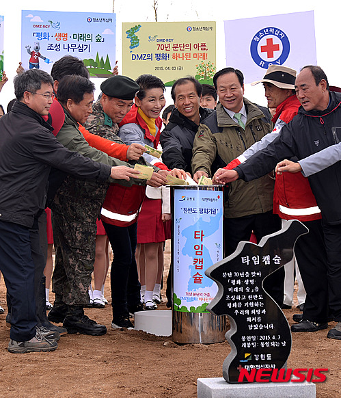 【철원=뉴시스】박동욱 기자 = 3일 오전 강원도 철원 DMZ평화문화광장 일대에서 'DMZ-RCY 평화·생명·미래의 숲 조성' 식목행사에 앞서 진행된 통일기원 타임캡슐 매설식에서 김성주 대한적십자사 총재와 최문순 강원도지사 등 내빈들이 작성한 소원카드를 타임캡슐에 넣고 있다.