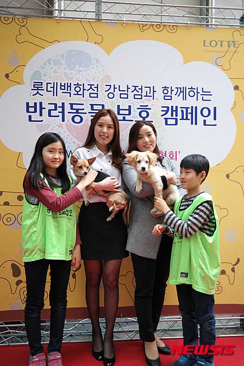 【서울=뉴시스】전신 기자 = 5일 서울 대치동롯데백화점 강남점에서 모델들이 '롯데백화점 강남점과 함께 하는 반려동물 보호 캠페인'을 홍보하고 있다. 동물사랑실천협회와 함께 진행하는 이번 캠페인은 버려진 유기견들을 보호하고 새로운 주인을 찾아주는 취지로 입양센터를 동시에 운영, 애견을 동반한 고객에게는 반려동물 인식표 목걸이 서비스 를 제공하고 현장에서 반려동물과 함께 사진을 찍어 즉석에서 인화해주는 포토 이벤트도 함께 진행한다. 2015.04.05. (사진=롯데백화점 제공)