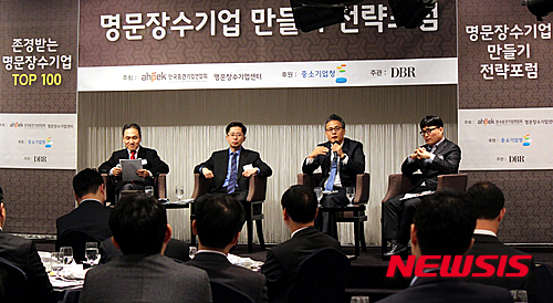 【서울=뉴시스】8일 서울 서초구 팔래스호텔 다이너스티홀에서 열린 '제7회 명문장수기업 만들기 전략포럼'에서 이윤철(왼쪽부터) 산업정책연구원 이사장, 송재용 서울대학교 교수, 김승환 아모레퍼시픽 전무, 김남국 동아일보 미래전략연구소 편집장이 '오너의 선택Ⅱ : 전문화 전략 VS 다각화 전략'을 주제로 토론을 하고 있다. 2015.04.08. (사진=한국중견기업연합회 제공)