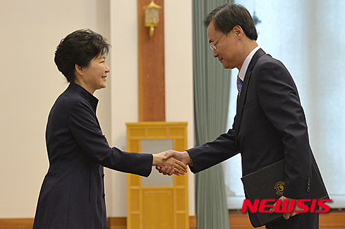 【서울=뉴시스】김영욱 기자 = 박근혜 대통령이 10일 오전 청와대에서 이용준 주이탈리아 대사에게 신임장을 수여하고 있다. 2015.04.10.
