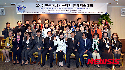 【서울=뉴시스】조성봉 기자 = 권용현(맨앞 왼쪽 다섯번째) 여성가족부 차관이 10일 오후 서울 서대문구 연세대학교 동문회관에서 열린 '2015 한국여성체육학회 춘계학술대회'에서 참석자들과 기념촬영을 하고 있다. 2015.04.10.(사진=여성가족부 제공)
