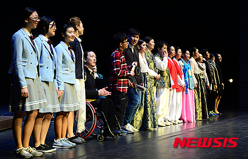 【서울=뉴시스】조성봉 기자 = 20일 오전 서울 서초구 국립국악원 예악당에서 열린 ‘장애인의 날 기념 우리도 스타’ 리허설 공연에서 전 출연진들이 '아리랑'을 부르고 있다. 2015.04.20.