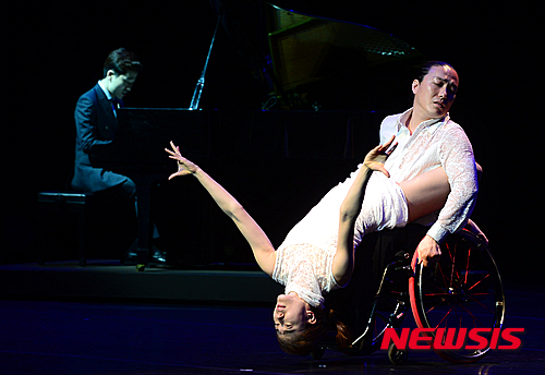 【서울=뉴시스】조성봉 기자 = 20일 오전 서울 서초구 국립국악원 예악당에서 열린 ‘장애인의 날 기념 우리도 스타’ 리허설 공연에서 장애인 피아니스트 최준, 휠체어 무용가 김용우(오른쪽)와 김씨 아내인 현대무용가 이소민이 멋진 무대를 선보이고 있다. 2015.04.20.