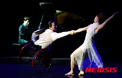 【서울=뉴시스】조성봉 기자 = 20일 오전 서울 서초구 국립국악원 예악당에서 열린 ‘장애인의 날 기념 우리도 스타’ 리허설 공연에서 장애인 피아니스트 최준, 휠체어 무용가 김용우(가운데)와 김씨 아내인 현대무용가 이소민이 멋진 무대를 선보이고 있다. 2015.04.20.