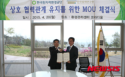 【서울=뉴시스】이원(오른쪽) 한국법제연구원장과 이종인 한국원자력공단 이사장이 20일 경북 경주시 한국원자력환경공단에서 상호협력 업무협약을 체결한 뒤 기념촬영을 하고 있다. 2015.04.20. (사진=한국법제연구원 제공)