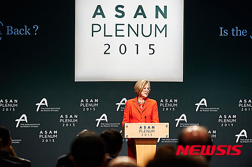 【서울=뉴시스】28일 오전 서울 용산구 그랜드하얏트호텔에서 열린 '아산플래넘 2015'에 참석한 카렌 엘리엇 하우스 페퍼다인대 교수가 기조연설을 하고 있다. 2015.04.28. (사진=아산정책연구원 제공)