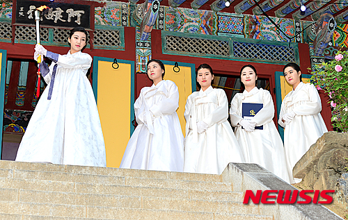 【밀양=뉴시스】 안지율 기자 = 7일 오후 ‘New 밀양아리랑’ ‘함께하는 아리랑 미래로 세계로!’ 라는 주재로 밀양강 둔치 야외공연장에서 제57회 밀양아리랑대축제가 열리고 있다. 이날 3대 정신 중 아랑낭자의 정순 불씨를 단군 성조께 봉헌하기 위해 아랑규수가 아랑사당을 나서 천진궁으로 향하고 있다. 이 축제는 오는 10일까지 열린다. 2015.05.08.