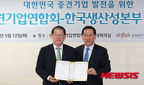 【서울=뉴시스】한국중견기업연합회(회장 강호갑)는 12일 오전 서울 마포구 중견련 대회의실에서 한국생산성본부(회장 홍순직)와 '대한민국 중견기업의 발전을 위한 업무협약'을 체결했다. 강호갑 회장과 홍순직 회장이 기념촬영을 하고 있다. 2015.05.12. (사진=한국중견기업연합회 제공)