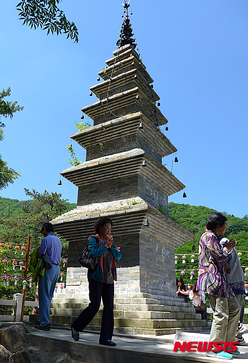 【정선=뉴시스】홍춘봉 기자 = 불기 2559년 부처님 오신날을 맞아 25일 강원 정선군 고한읍 함백산 중턱에 위치한 1000년 고찰인 대한불교 조계종 정암사 수마노탑을 찾은 불자들이 보물 제410호 수마노탑에서 부처님의 자비를 기원하며 탑돌이를 하고 있다. 2015.05.25.