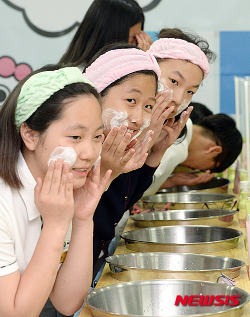 【서울=뉴시스】최동준 기자 = 26일 오전 서울 동작중학교에서 열린 LG생활건강, 청소년 환경교육 '빌려쓰는 지구 스쿨'에서 학생들이 친환경 세안 체험을 하고 있다.