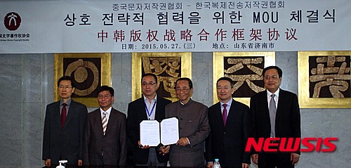 【서울=뉴시스】27일 중국 제남 시에서 한국 복제전송저작권협회와 중국 문자저작권협회간 저작권 협력 양해각서(MOU) 체결식에서 참석자들이 기념촬영을 하고 있다.
