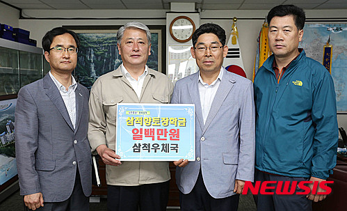 【삼척=뉴시스】홍춘봉 기자 = 강원 삼척우체국 김흥수(오른쪽 두 번 째) 국장은 28일 삼척시청을 방문해 김양호 삼척시장에게 지역인재 양성에 써달라며 삼척향토장학금 100만원을 기탁하고 있다. 2015.05.28. (사진=삼척시 제공)