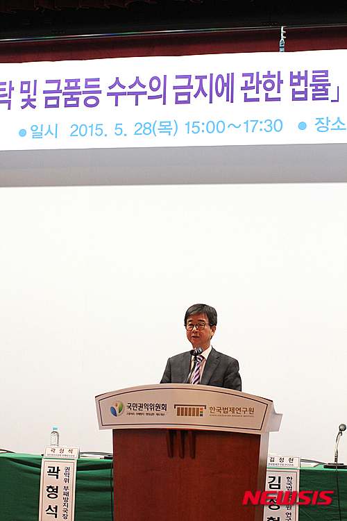 【서울=뉴시스】28일 서울 중구 포스트타워 대회의실에서 열린 '부정청탁 및 금품 등 수수의 금지에 관한 법률' 시행령 제정을 위한 공개토론회에 참석한 한국법제연구원 이원 원장이 인사말을 하고 있다. 2015.05.28. (사진=한국법제연구원 제공)