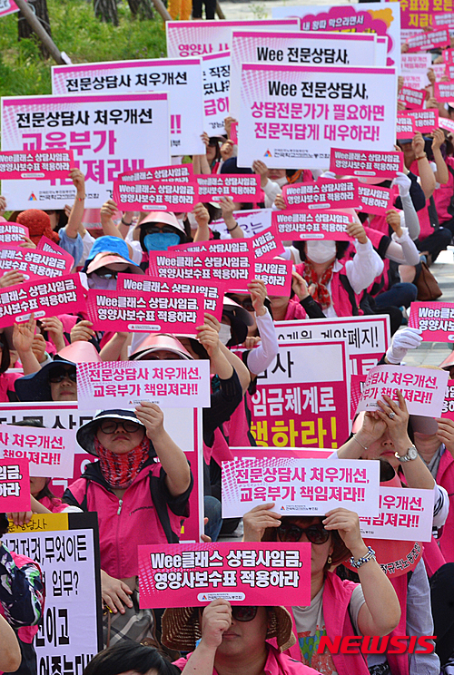 【세종=뉴시스】김기태 기자 = 29일 오후 세종시 정부세종청사 교육부 앞에서 전국학교비정규직노동조합 조합원들이 전국 Wee 전문상담사 처우개선 및 고용안정 쟁취를 위한 학교비정규직 노동자대회를 갖고 있다. 2015.05.29.