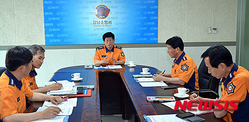 【서울=뉴시스】권순경 서울소방재난본부장이 16일 서울 강남소방서 메르스 대책 상황실에서 제4방면(강남, 강동, 서초, 송파) 소방관서장 긴급회의를 주재하고 있다. 2015.06.16. (사진=강남소방서 제공)