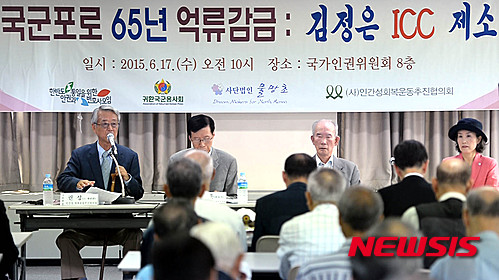 【서울=뉴시스】박문호 기자 = 17일 오전 서울 중구 무교로 국가위원회에서 열린 '국군포로 65년 억류감금 김정은 ICC(국제 휴전 감시 위원회) 제소' 기자회견에서 권성 인간성 회복운동추진협의회 회장, 김태훈 변호사, 유영복 귀환국군용사회 회장, 박선영 물망초 이사장이 패널로 나서 발표하고 있다. 2015.06.17.