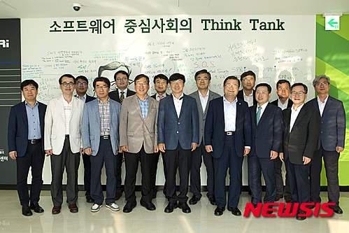 【서울=뉴시스】미래창조과학부가 19일 저녁 경기도 성남시 분당구 글로벌R&D센터 소프트웨어정책연구소에서 '대학 소프트웨어(SW)교육 혁신 및 확산방안' 을 주제로 '창조경제 실현을 위한 제14차 ICT정책 해우소' 토론회를 개최했다. 최재유 미래창조과학부 제2차관(앞줄 오른쪽 세 번째)이 토론회 참석자들과 기념촬영 하고 있다. 2015.06.21. (사진=미래창조과학부 제공)