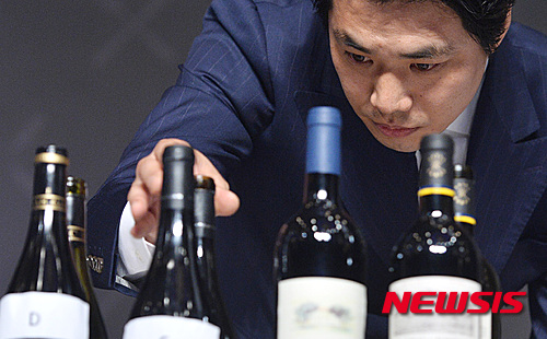 【서울=뉴시스】고승민 기자 = 7일 오후 서울 밀레니엄 서울 힐튼 호텔에서 프랑스 농업식품 산림부(MAAF) 주최로 열린 '제14회 한국 소믈리에 대회 결선'에서 안인호 소믈리에가 블라인드 테이스팅을 하고 있다. 2015.07.07.