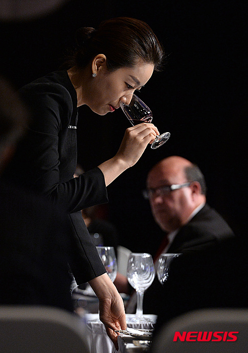 【서울=뉴시스】고승민 기자 = 7일 오후 서울 밀레니엄 서울 힐튼 호텔에서 프랑스 농업식품 산림부(MAAF) 주최로 열린 '제14회 한국 소믈리에 대회 결선'에서 정미현 소믈리에가 블라인드 테이스팅을 하고 있다. 2015.07.07.