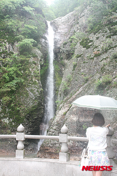 【영동=뉴시스】김기준 기자 = 우리나라 3대 악성으로 추앙받는 난계 박연(朴堧·1378~1458) 선생이 자주 찾아가 피리를 불었다고 해서 일명 '박연폭포'로 불리는 충북 영동군 심천면 옥계리 옥계폭포가 지난 12일 장맛비에 불어난 물줄기로 장관을 이루고 있다.2015.07.13.