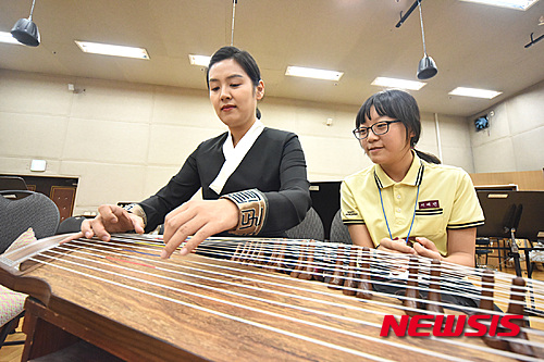 【서울=뉴시스】15일 서울 서초구 국립국악원에서 열린 국악 체험 프로그램에 참여한 국립국악원 창작악단의 박세연씨와 상암중 서예빈 양이 가야금을 연주하고 있다. 2015.07.15. (사진=국립국악원 제공)