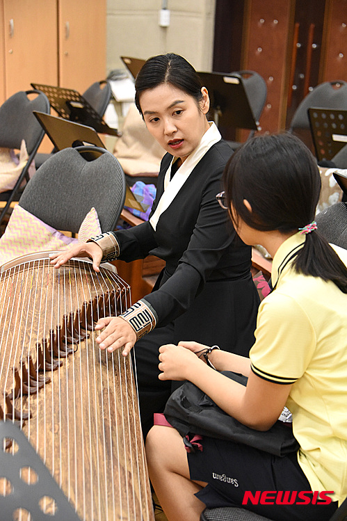 【서울=뉴시스】15일 서울 서초구 국립국악원에서 열린 국악 체험 프로그램에 참여한 국립국악원 창작악단의 박세연씨와 상암중 서예빈 양이 가야금을 연주하고 있다. 2015.07.15. (사진=국립국악원 제공)