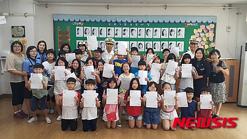【수원=뉴시스】김경호 기자= 17일 경기 수원시 팔달구 화홍초등학교에서 수원중부경찰서 경비교통과장, 교통경찰과 녹색어머니회, 학부모 등이 참석한 가운데 '엄마, 아빠에게 교통안전 편지쓰기' 행사가 열렸다. 2015.07.17(사진= 수원시 제공)