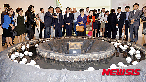 【서울=뉴시스】 추상철 기자 = 광복 70주년 기념전 '북한프로젝트' 개막식이 열린 21일 오후 서울시립미술관에서 홍용표 통일부장관과 박원순 서울시장 등이 내빈이 북한의 생활상이 담긴 유화, 포스터 등을 살펴보고 있다.