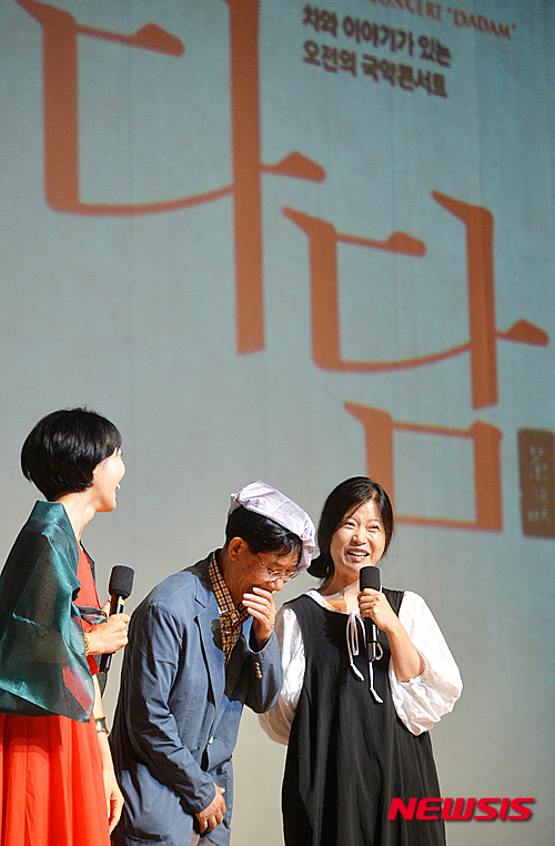 【서울=뉴시스】장남수 인턴기자 = 29일 오전 서울 서초구 국립국악원 우면당에서 열린 '오전의 국악콘서트 - 다담'에서 이효재(오른쪽) 문화디자이너가 비오는 날 남자에게 좋을 보자기를 만들어 홍성운(가운데) 문화융성지원팀장에게 씌워준 후 즐거워 하고 있다. 2015.07.29.