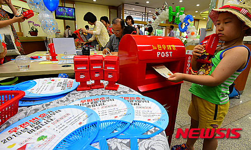 【수원=뉴시스】이정선 기자 = 새 우편번호 시행 첫날인 3일 오전 경기도 수원시 동수원우체국에서 고객들이 추억의 우체통에 넣을 '행복한 이야기' 손편지를 작성하고 있다.