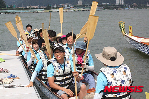 【화천=뉴시스】한윤식 기자 = 4일 수상레포츠의 메카인 강원 화천 북한강 일대에서 펼쳐지는 쪽배축제장에서 열린 화천군청 소속 공무원 용선대회 참가자들이 출발에 앞서 화이팅을 외치고 있다. 2015.08.04.