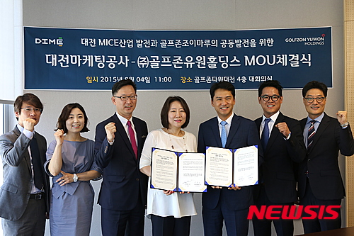【대전=뉴시스】조명휘 기자 = 이명완 대전마케팅공사 사장(왼쪽에서 네 번째)과 신종성 ㈜골프존조이마루 사장(〃다섯 번째)등이 4일 유성구 도룡동 골프존 조이마루 회의실에서 MICE산업발전을 위한 상생협약 체결한 뒤 기념촬영을 하고 있다. 2015.08.04. (사진= 대전마케팅공사 제공)