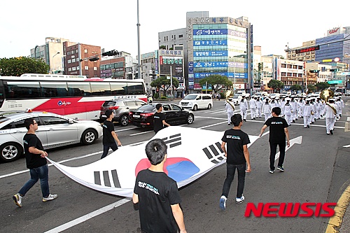 【제주=뉴시스】 고동명 기자= 15일 오후 제주국제관악제 참가자들이 제주문예회관에서 광양로터리와 중앙로를 거쳐 탑동해변공연장으로 향하는 광복절 경축 거리행진을 하고 있다. 2015.08.16.