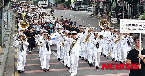 【제주=뉴시스】 고동명 기자= 15일 오후 제주국제관악제 참가자들이 제주문예회관에서 광양로터리와 중앙로를 거쳐 탑동해변공연장으로 향하는 광복절 경축 거리행진을 하고 있다. 2015.08.16.