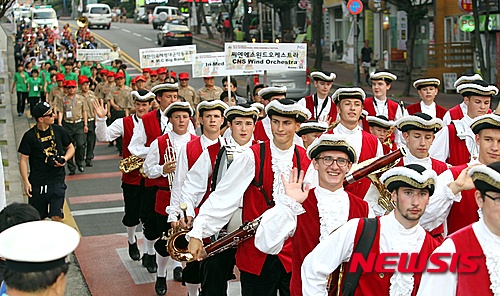 【제주=뉴시스】 고동명 기자= 15일 오후 제주국제관악제 참가자들이 제주문예회관에서 광양로터리와 중앙로를 거쳐 탑동해변공연장으로 향하는 광복절 경축 거리행진을 하고 있다. 2015.08.16.