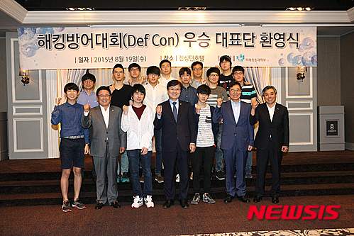 【서울=뉴시스】미래창조과학부가 19일 오후 서울 영등포구 켄싱턴호텔에서 해킹방어대회(Def Con) 우승 대표단 환영식을 개최했다. 최양희 미래창조과학부 장관이 임종인 안보특별보좌관, 유준상 한국정보기술연구원장, 백기승 한국인터넷진흥원장, 해킹방어대회 우승 대표단과 기념촬영 하고 있다. 2015.08.19. (사진=미리창조과학부 제공)