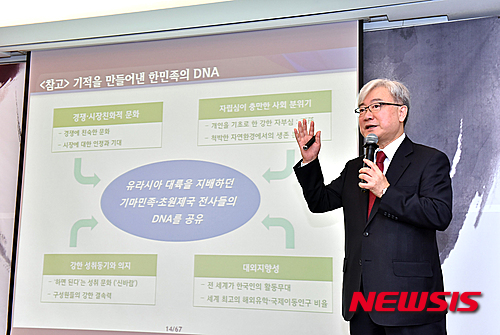【서울=뉴시스】한국중견기업연합회는 9일 서울 소공동 롯데호텔에서 김석동 전 금융위원장 초청, '중견기업 진화를 위한 기마민족 경제 DNA 회복'을 주제로 제160회 Ahpek INSIGHTS 강연회를 개최했다. 김 전 위원장이 강연을 하고 있다. 2015.09.09. (사진=한국중견기업연합회 제공)