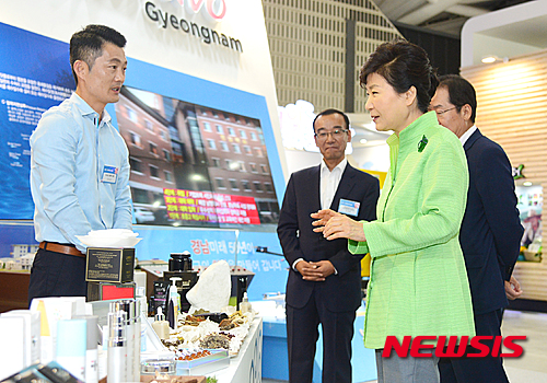 【인천=뉴시스】전진환 기자 = 박근혜 대통령이 9일 오전 인천 송도컨벤시아에서 열린 2015 지역희망 박람회에 참석, 경상남도 부스에서 KB코스메틱 김유근 대표의 설명을 듣고 있다. 2015.09.09.