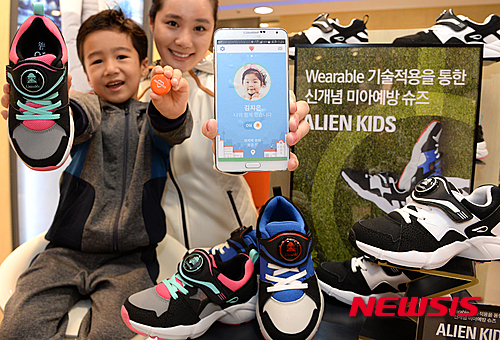 【서울=뉴시스】이종철 기자 = 10일 서울 중구 롯데백화점 본점 7층 프로스펙스 매장에서 모델들이 미아 예방이 가능한 스마트 아동화 '에어리언 키즈'를 선보이고 있다.