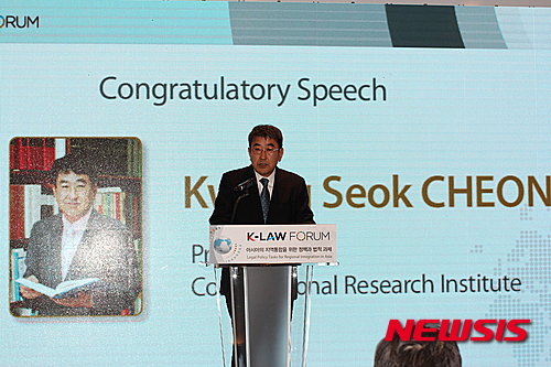 【서울=뉴시스】16일 서울 서초구 팔래스호텔에서 '아시아의 지역통합을 위한 정책과 법적과제'를 주제로 열린 법제교류협력포럼에 참석한 전광석 헌법재판연구원장이 축사를 하고 있다. 2015.09.16. (사진=한국법제연구원 제공)
